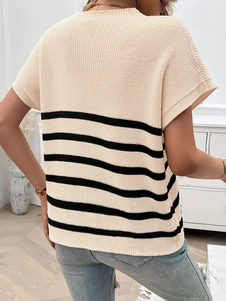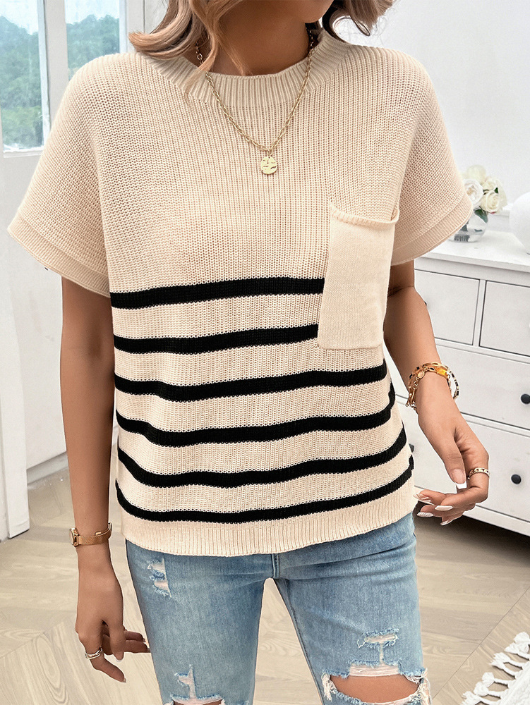 Top Women’s Style Round Neck Stripe Contrast Short sleeved Sweater
